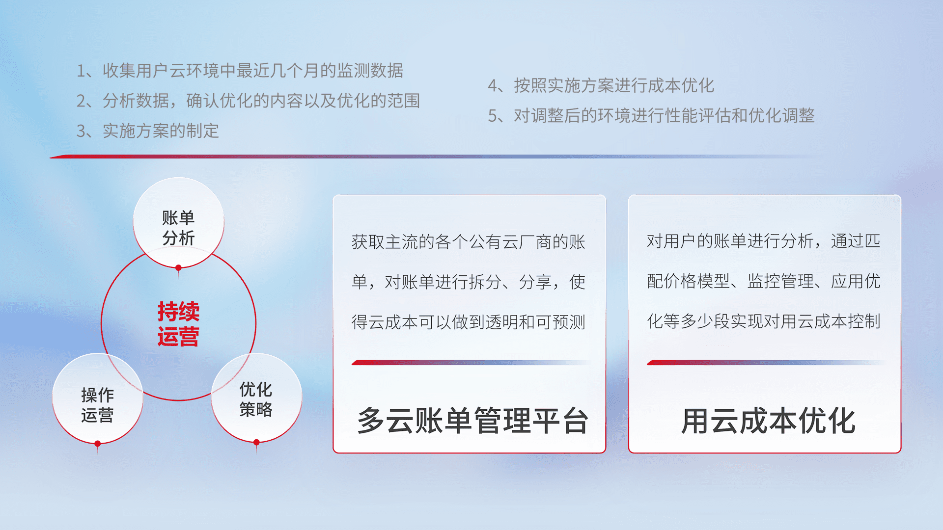 通过多云纳管,,,,以统一的资源数据模型把客户的云资源进行抽象和封装,,,,进而实现对多云资源的统一操作,,保障云资源管理的可靠性、、稳定性与可用性。。。量身定制化运维内容,,,配置、、、开发运维、、、、补丁管理、、、备份、、、监控、、认证和访问管理、、审计和日常巡检等,,,,保障在用云过程中的可靠度,,,,稳定度以及高可用率。。。